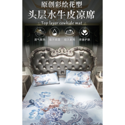 彩绘牛皮席头层水牛皮凉席1.5米可折叠真皮软席子1.8m床上三件套